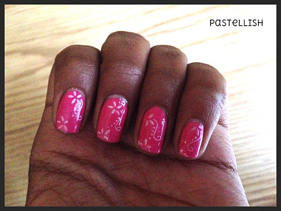I used Sally Hansen's Presto Pink for the background and a French White Creme polish for the designs. I wouldn't recommend using the French White Creme, however. Use a thicker polish instead.